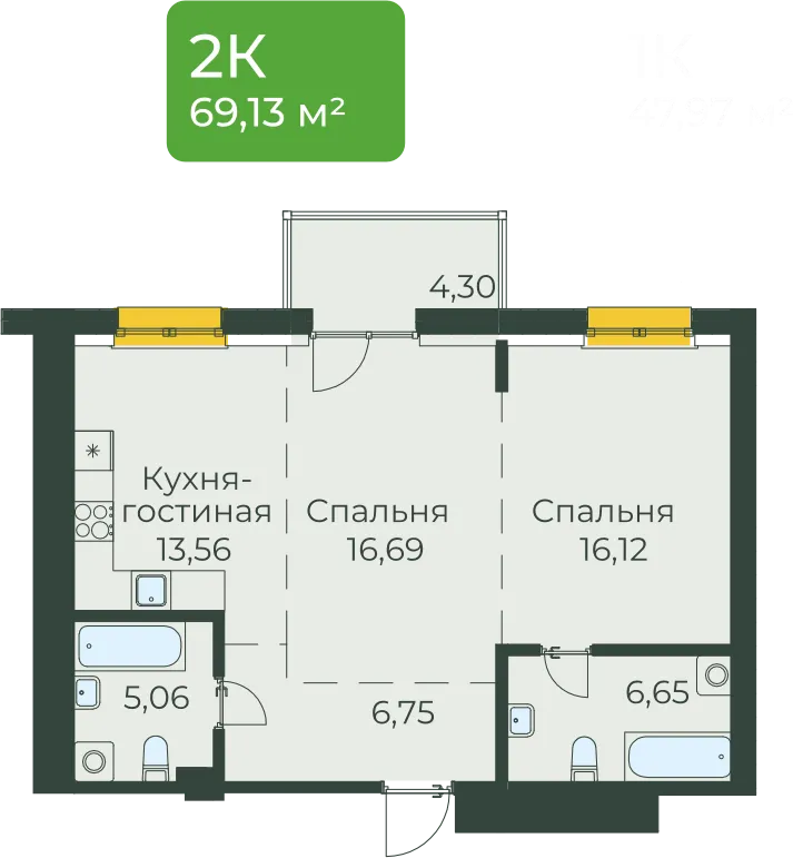 2-комнатная 69 м2
